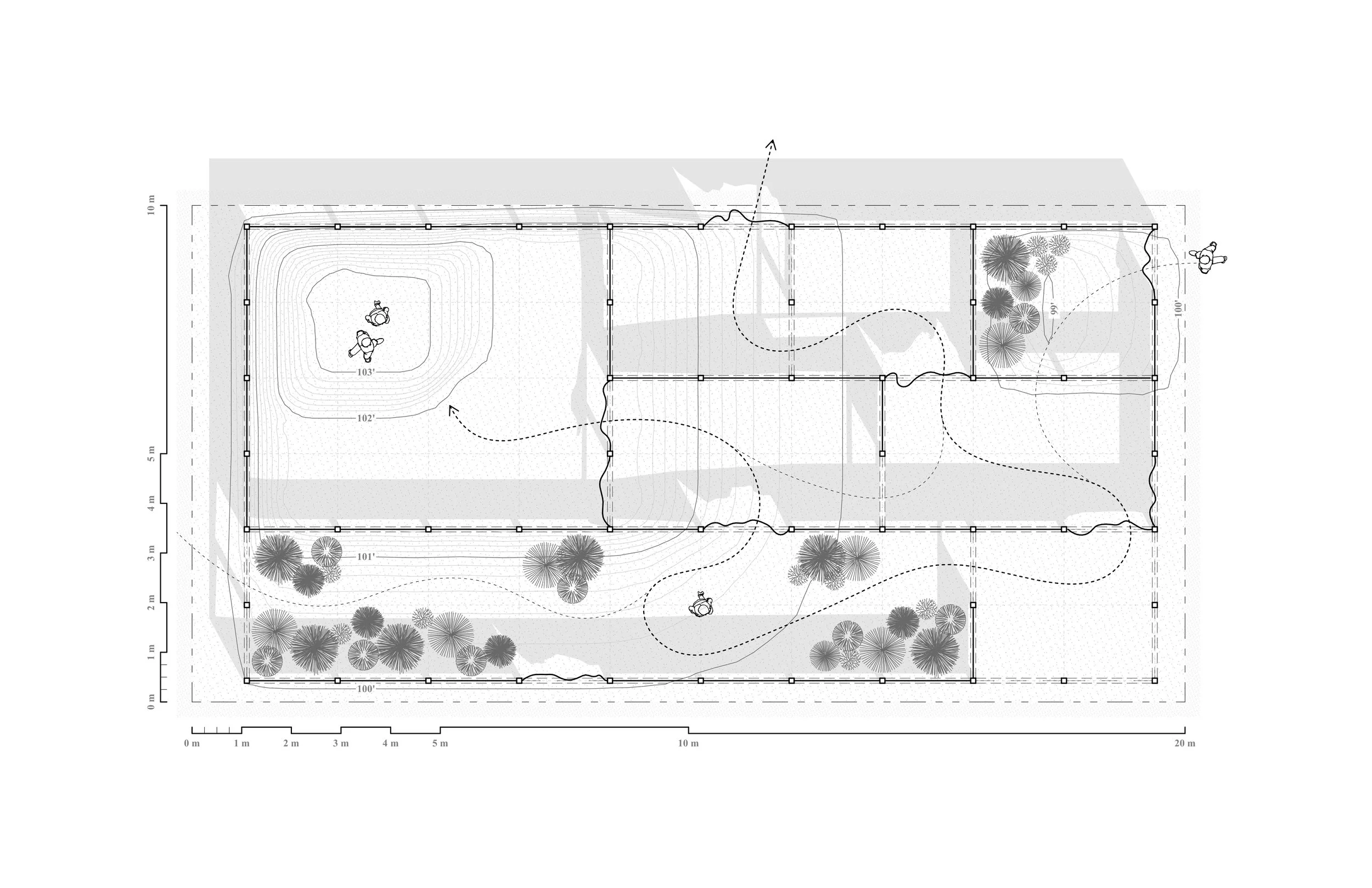 Articulée autour d’une trame d’axes rigoureuse, l’intersection des tissus crée une série de zones distinctes, certaines facilement accessibles, d’autres plus énigmatiques. Chaque espace délimité devient alors lieu de pause, de contemplation, encourageant la réflexion et l’échange entre les visiteurs.