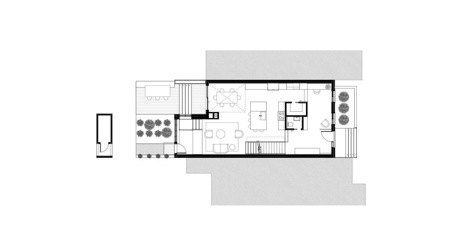 S’inspirant des caractéristiques volumétriques typiques de la maison « shoebox », la nouvelle intervention se distingue par un retrait au niveau de la façade avant. Ce geste permet à la fois une réinterprétation contemporaine du volume d’origine et l’intégration d’un espace végétalisé au deuxième étage. Une margelle plantée vient également enrichir l’expérience des espaces de vie, tant intérieurs qu’extérieurs, en favorisant un dialogue harmonieux entre architecture et paysage.