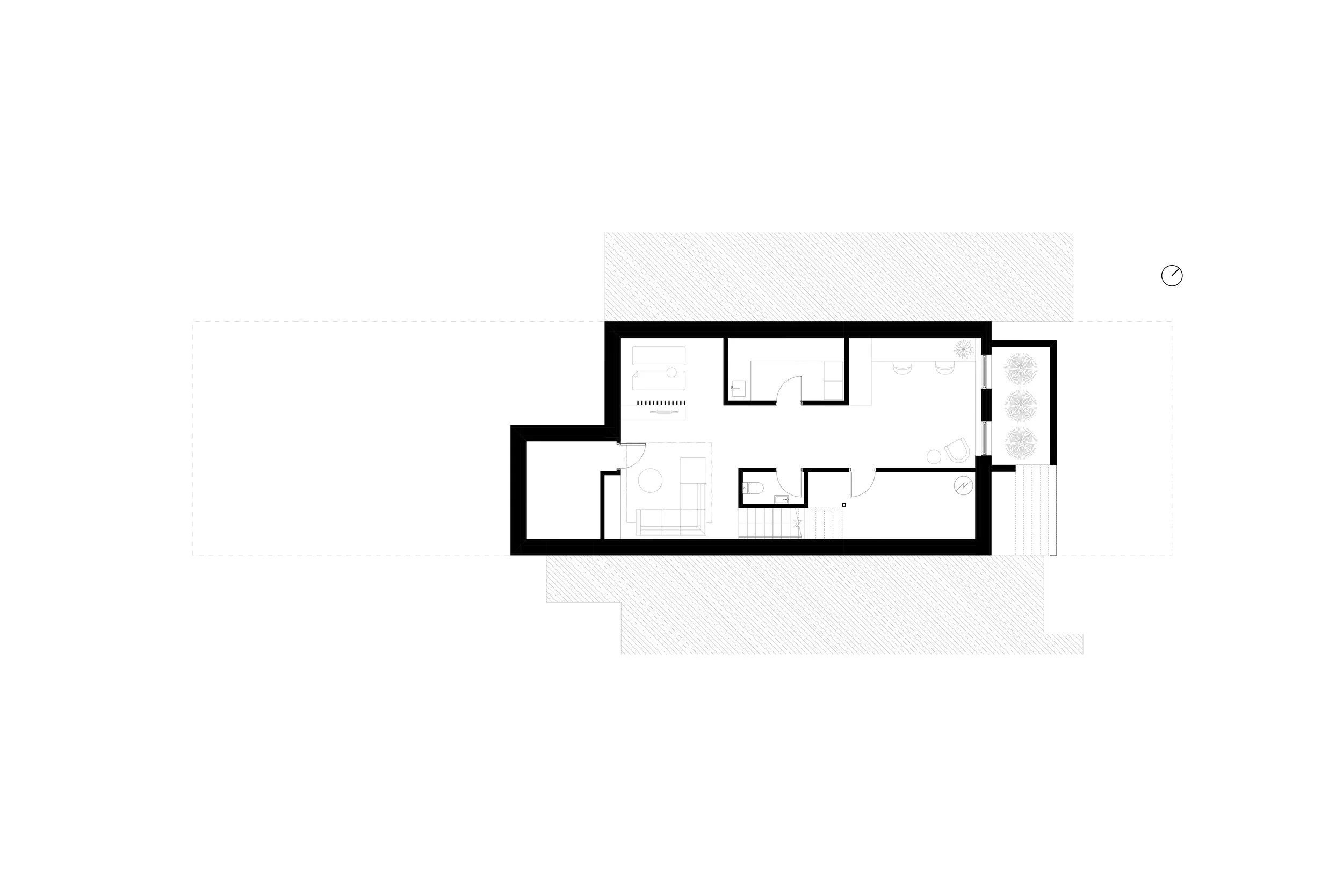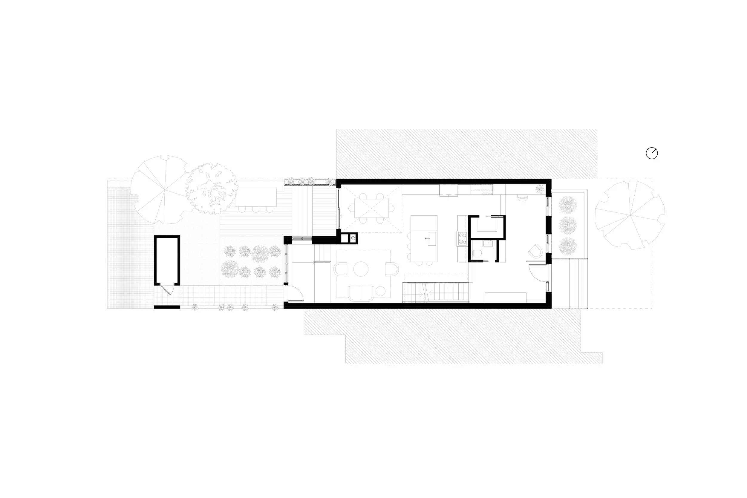 L’organisation intérieure a également été pensée dans un souci d’efficience fonctionnelle. Le rez-de-chaussée se déploie sur deux niveaux afin de respecter les niveaux distincts de fondation propres au shoebox existant, permettant ainsi d’inscrire l’intervention dans la logique constructive du bâtiment tout en améliorant la qualité des espaces de vie.